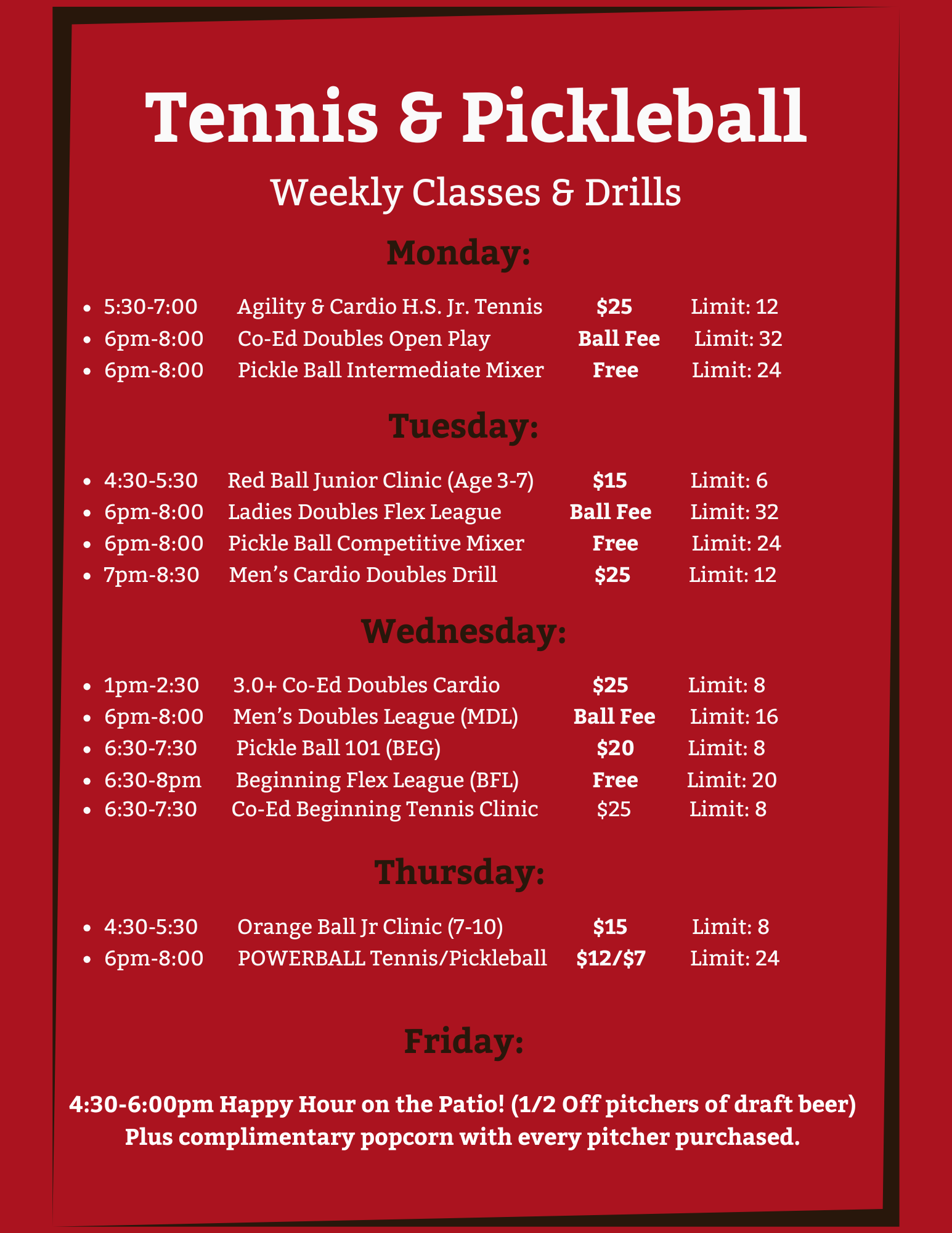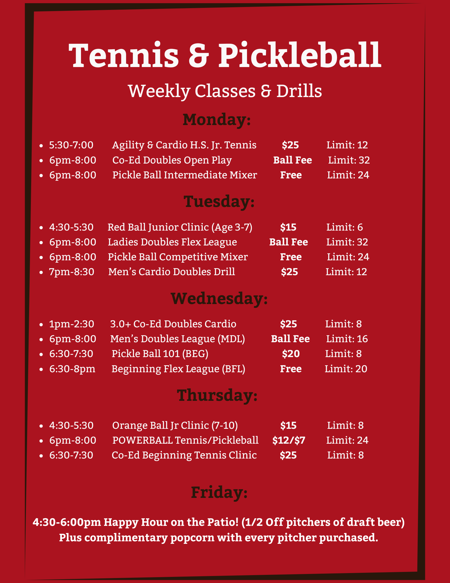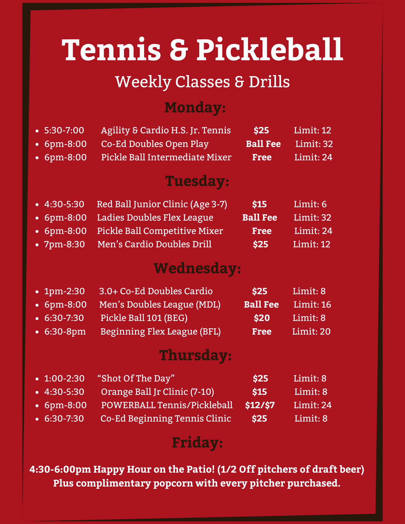 Please check out our weekly schedule of events, which can be found under the 'Tennis Schedule and Events' tab. The schedule changes each season. Be sure to check back for updated events.