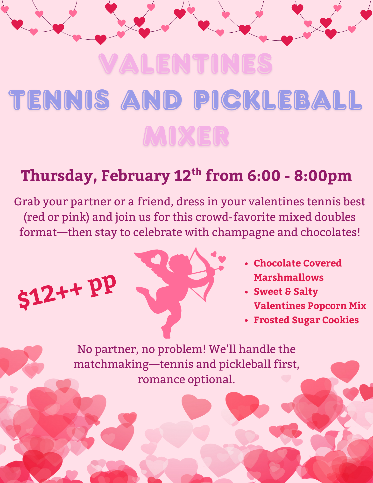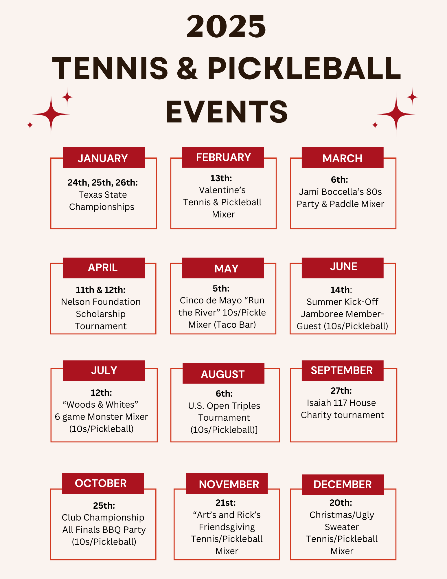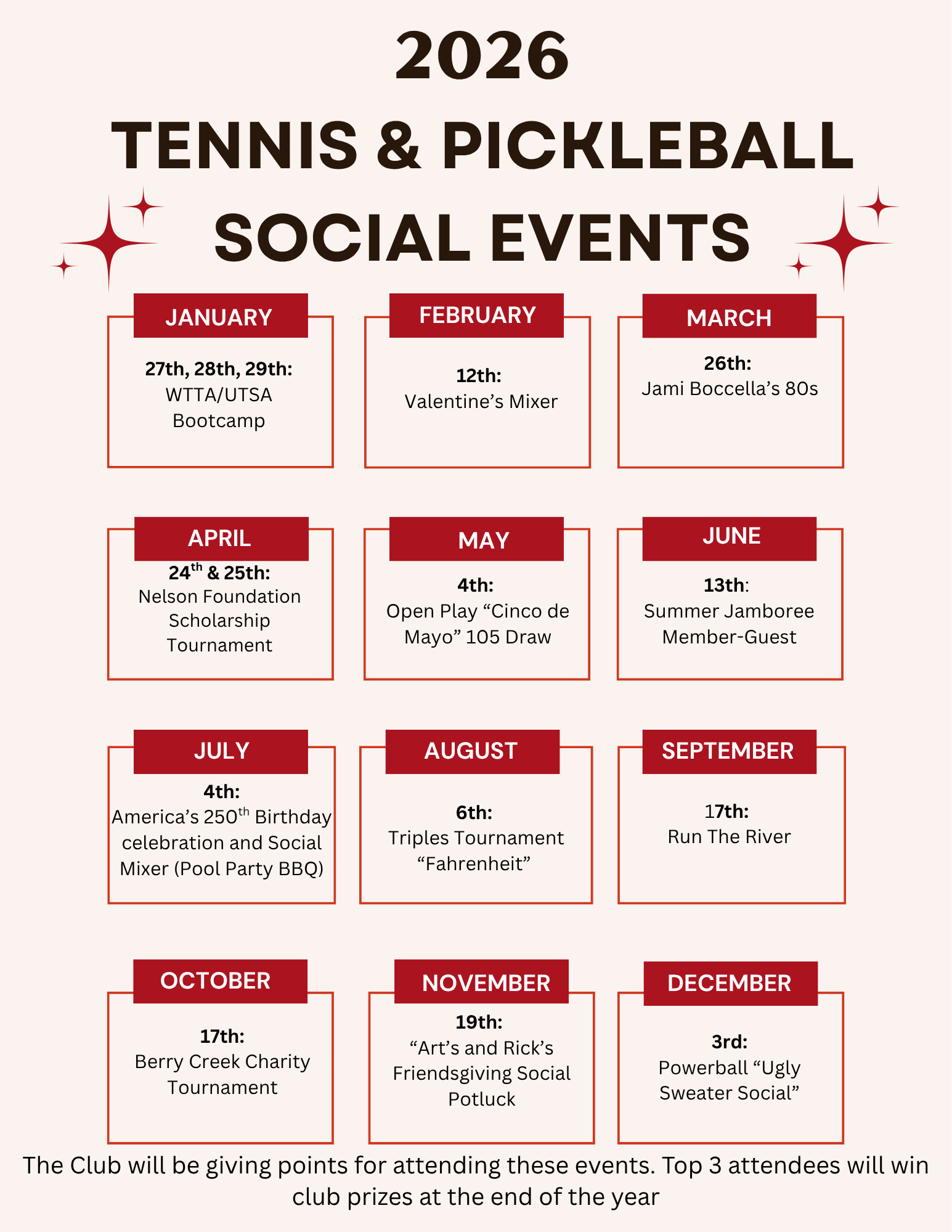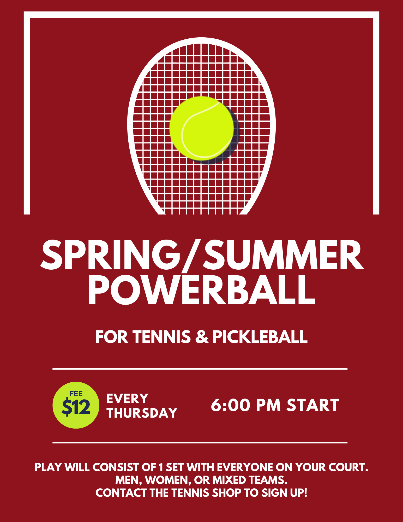 Please check out our weekly schedule of events, which can be found under the 'Tennis Schedule and Events' tab. The schedule changes each season. Be sure to check back for updated events.
